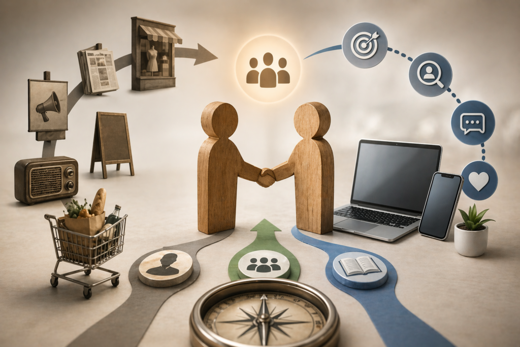 By the time of the fast-paced post-war years, marketing began to take on its hue as a term that included the ways a company or product would try to persuade consumers to buy something. It could be print advertising, radio commercials, men walking around in sandwich boards, flyers, store window signage or displays.